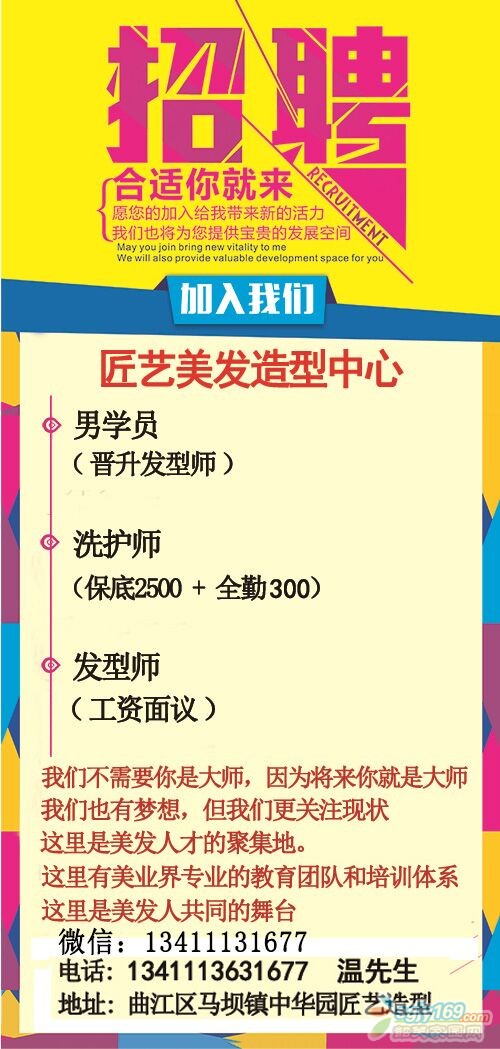 正文摘要:我們不需要你是大師,因為將來你就是大師 我們也有夢想,但我們更關(guān)注現(xiàn)狀 這里是美發(fā)人才的聚集地 這里有美發(fā)界專業(yè)的教育團隊和培訓(xùn)體系 這里是美發(fā)人共同的舞臺 上班時間:早上十點---晚上十點 月休三天, ... |